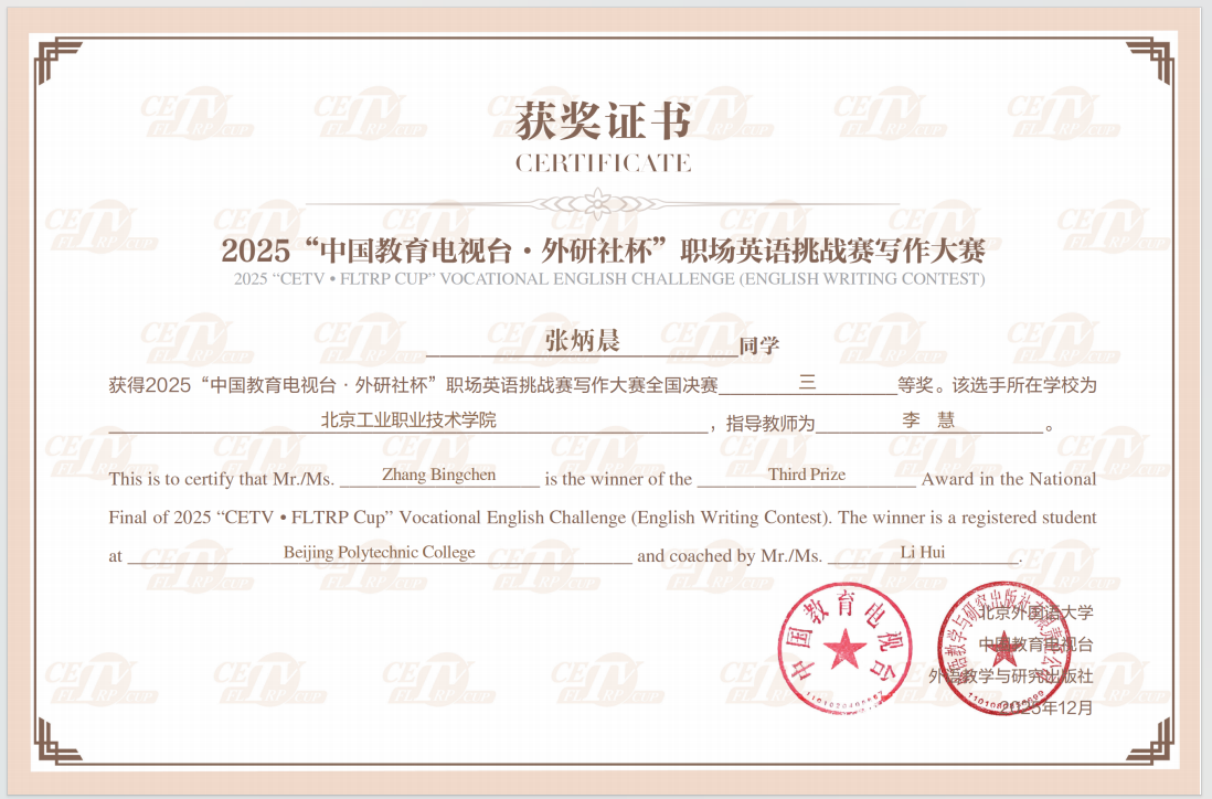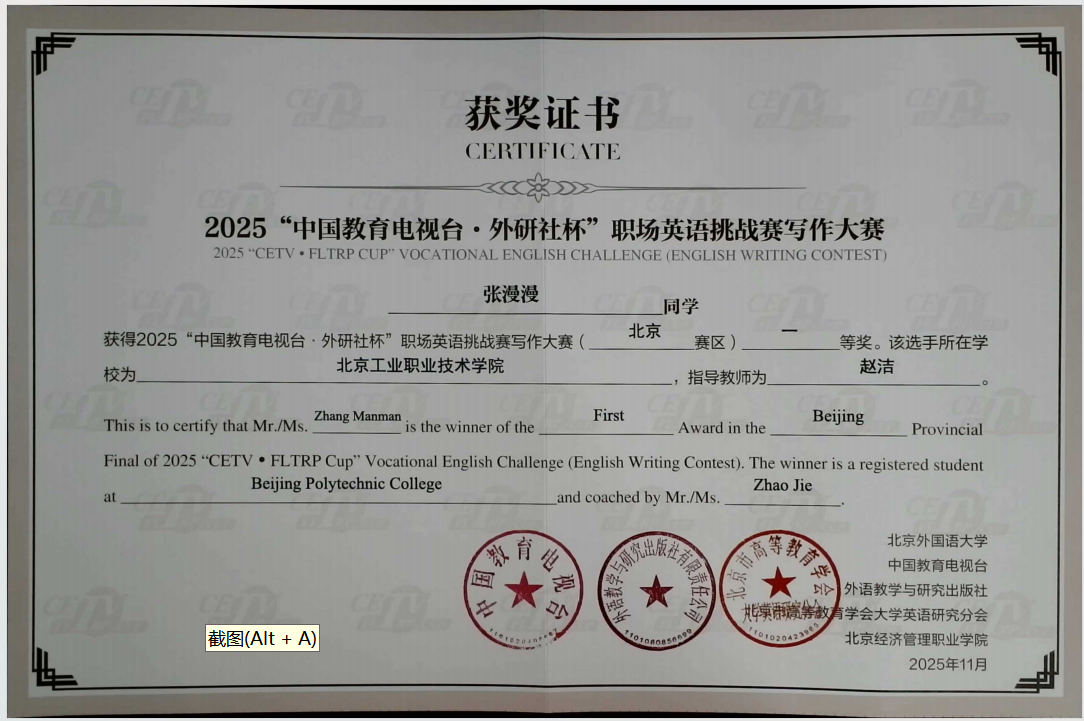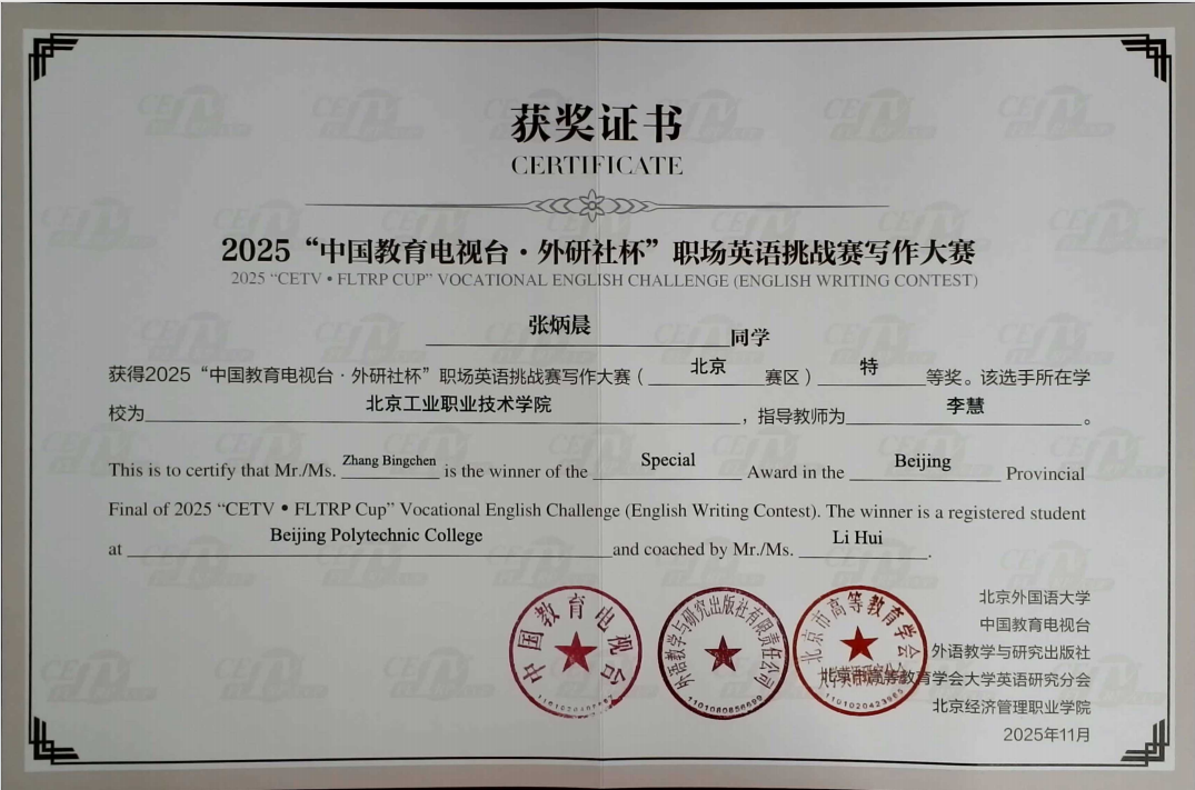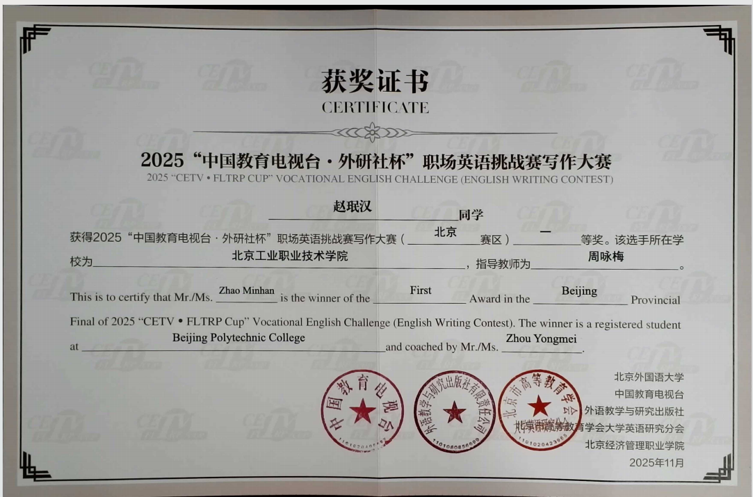 近日,2025“中国教育电视台·外研社杯”职场英语挑战赛写作大赛落下帷幕,我校学子凭借扎实的英语功底与出色的写作能力斩获佳绩。此次赛事中,我校三名参赛同学表现亮眼,共夺得北京市特等奖1项、一等奖2项,其中获北京市特等奖的同学更代表北京市晋级全国决赛,最终斩获全国三等奖。