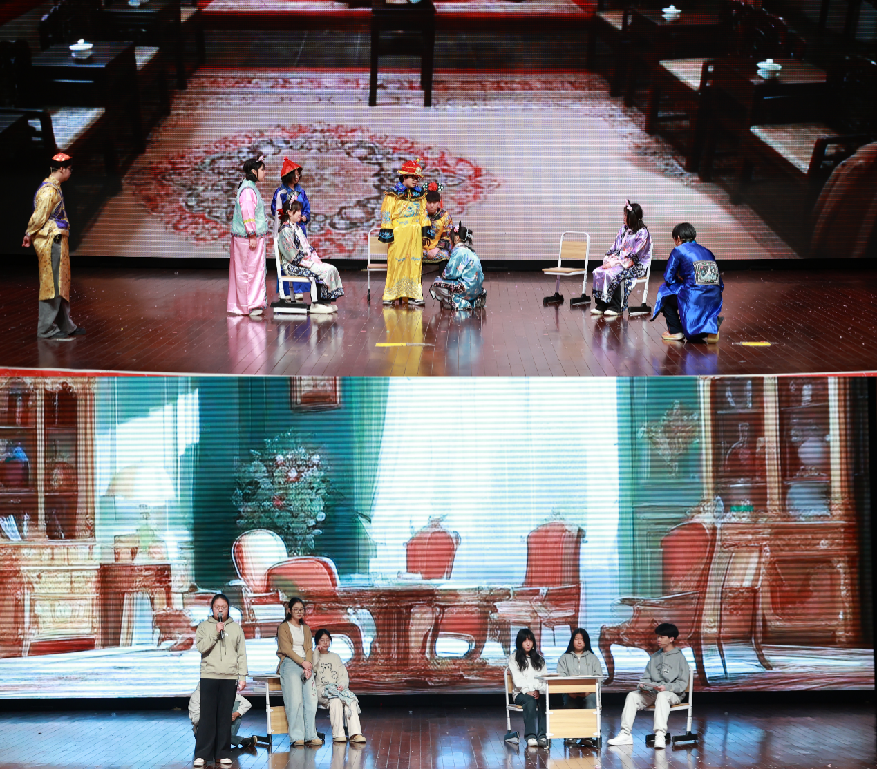 语言类节目笑点与温情并存,学生会宣传部带来的小品《谁杀死了周日》直击校园日常中的拖延心理,学生会生活部的《甄嬛传滴血认亲》爆笑复刻经典。