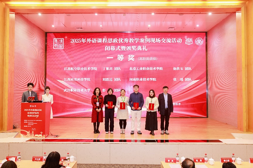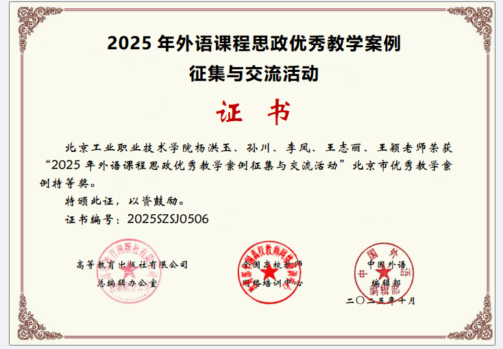 展示活动旨在持续推动全国外语课程思政高质量建设,助力构建固本铸魂的思想政治教育体系、素质精良的教师队伍体系,促进新时代立德树人工程落地见效,切实落实“为党育人、为国育才”的根本任务,为加快教育强国建设注入坚实力量。本届赛事自今年五月启动以来,共吸引来自全国567所本科及职业院校教师参赛,征集案例作品1037件。我校教学团队高度重视、精心备赛,凭借精准的教学目标、深入的思政挖掘与创新的教学设计,在省级遴选中脱颖而出,荣获特等奖并代表北京市参加全国总决赛。总决赛现场共有104支教学团队入围,其中职业院校组仅18支。在展示与答辩环节中,团队以扎实的教学功底与对课程思政的深刻理解,最终斩获全国一等奖,展现了扎实的育人成效与教学风采。