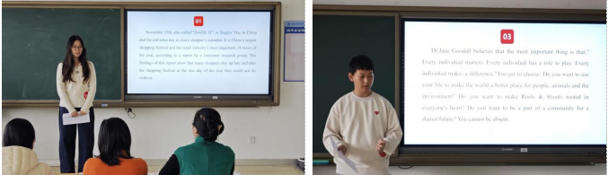 决赛分为“定题演讲”和“即兴问答”两个环节。在定题演讲中,选手们围绕课本内容,结合自身的观察和学习自行选择演讲主题,从环境问题、人工智能伦理、跨文化思考等多元视角展开论述,内通丰富翔实,表达流利准则,语调自然,展现出对所学内容的深刻思考与独特见解。