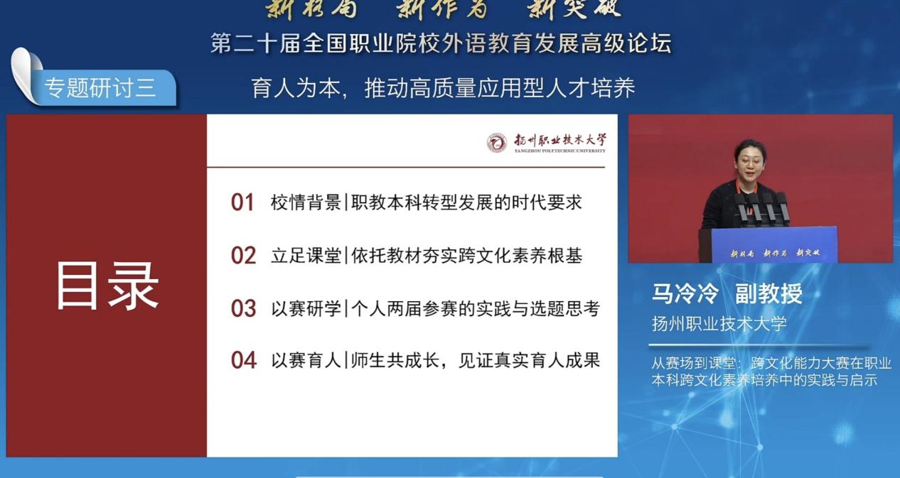 (扬州职业技术大学马冷冷副教授的报告主题为“从赛场到课堂:跨文化能力大赛在职业本科跨文化素养培养中的实践与启示”)