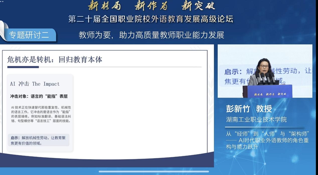 (湖南工业职业技术学院彭新竹教授的报告主题为“从‘经师’到‘人师’与‘架构师’——AI时代职业外语教师的角色重构与能力跃升”)